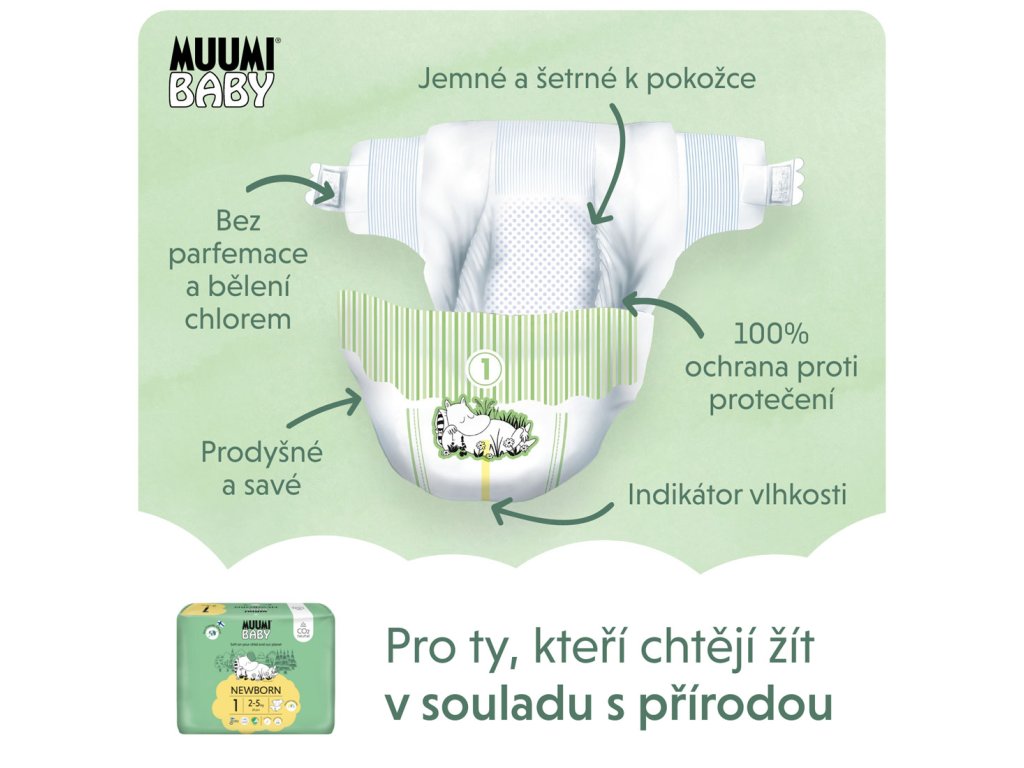 Citlivá pokožka novorozenců vyžaduje obzvláště šetrné pleny – proto jsme vytvořili pleny Muumi Baby Newborn, které jsou šetrné, bezpečné, extrémně spolehlivé, a navíc se speciálním střihem přes pupík, který chrání jejich pupeční šňůru. Plenky jsou hypoalergenní, vyrobené z čisté celulózy pocházející z finských lesů a s certifikací FSC. Ta je bělena pouze kyslíkem, a proto jsou plenky vhodné i pro tu nejcitlivější pokožku.