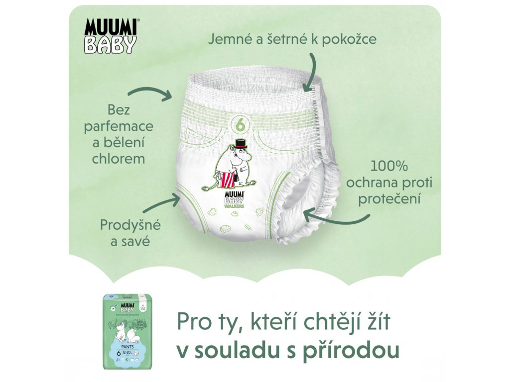 Plenkové kalhotky Muumi Baby Pants jsou určeny pro aktivní děti, které se už učí chodit. Jsou extrémně savé a díky pružnému materiálu perfektně drží i při zvýšeném pohybu, takže poskytují 100% ochranu proti protečení. Snadno se nasazují a stejně snadno se po rozepnutí i sundávají. Prodyšný materiál z čistých a měkkých rostlinných vláken udržuje pokožku děťátka suchou a zdravou během dne i noci. Plenky jsou hypoalergenní, vyrobené z čisté celulózy pocházející z finských lesů a s certifikací FSC. Ta je bělena pouze kyslíkem, a proto jsou plenky vhodné i pro tu nejcitlivější pokožku.