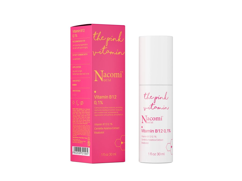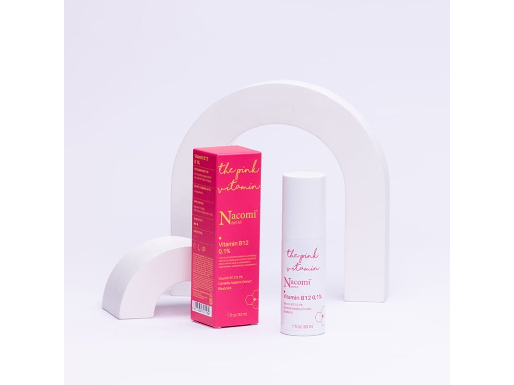 Za svou intenzivní růžovou barvu vděčí sérum vysokému obsahu vitamínu B12. Tento vitamín známý také jako kobalamin hraje důležitou roli v péči o pleť, přispívá k jejímu zdraví a vitalitě. Vitamin B12 díky svým regeneračním vlastnostem účinně podporuje úlevu od různých kožních problémů, jako je suchost, zarudnutí nebo přecitlivělost, a urychluje obnovu pleti. Dokonale vyživuje pokožku, poskytuje pocit hladkosti. Má antioxidační vlastnosti, což zpomaluje proces stárnutí pokožky. Pomáhá ji také rozjasnit a vyrovnat její barvu.