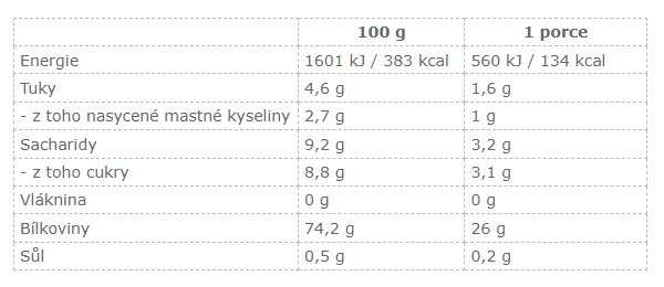 - Vysokým obsahem bílkovin (26 g v jedné porci)