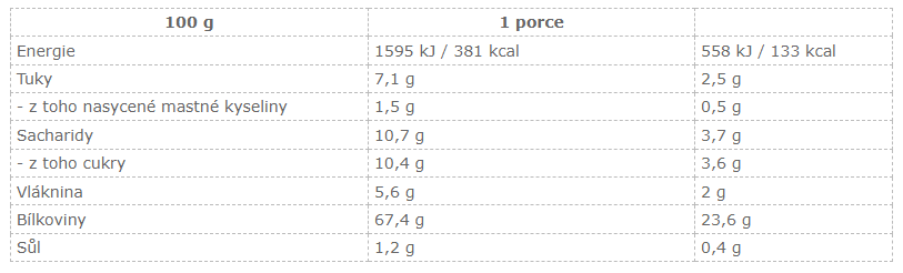 - Vysoký obsah bílkovin 63 % (22,2 g porce) a vlákniny.