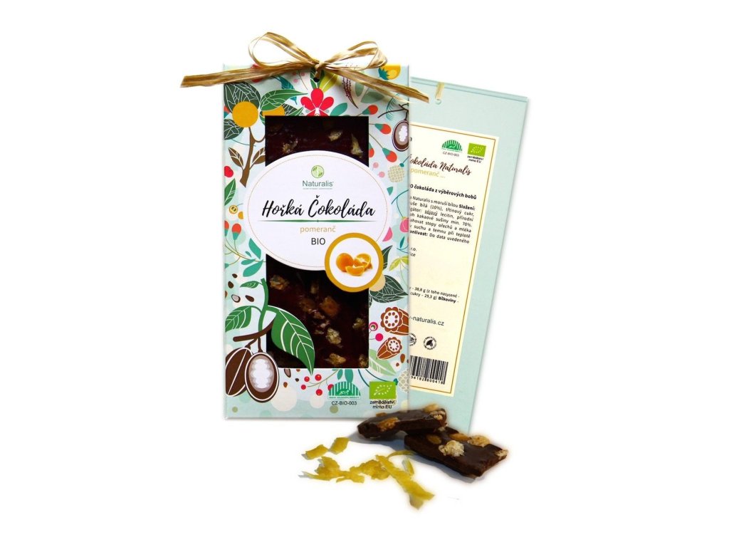 BIO čokolády Naturalis jsou vyráběny ručně v tradiční rodinné čokoládovně. Mistrovství našich chocolatiérů proměňuje každou tabulku v objekt radosti a touhy. Co stojí za její kvalitou? Zodpovědnost při výběru kakaových bobů, pečlivost při jejich prvotním zpracování a dlouholetá zkušenost s přípravou nijak nešizené čokolády. Pomeranč doplňuje chuťový zážitek o příjemný pocit z konzumace. Obsah kakaa (který určuje intenzitu chuti) je na úrovni 70 %.