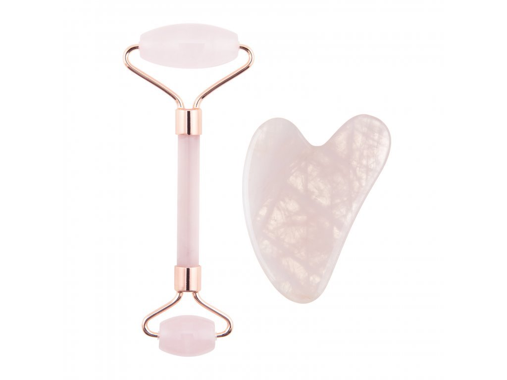 Masážní váleček (face-roller) i masážní destička Guasha jsou vyrobeny z růženínu. Ten bývá spojován s něhou, krásou a (sebe)láskou - je tak ideálním pomocníkem v každodenní péči o pleť, která je díky němu omlazená, pevnější a bez vrásek.