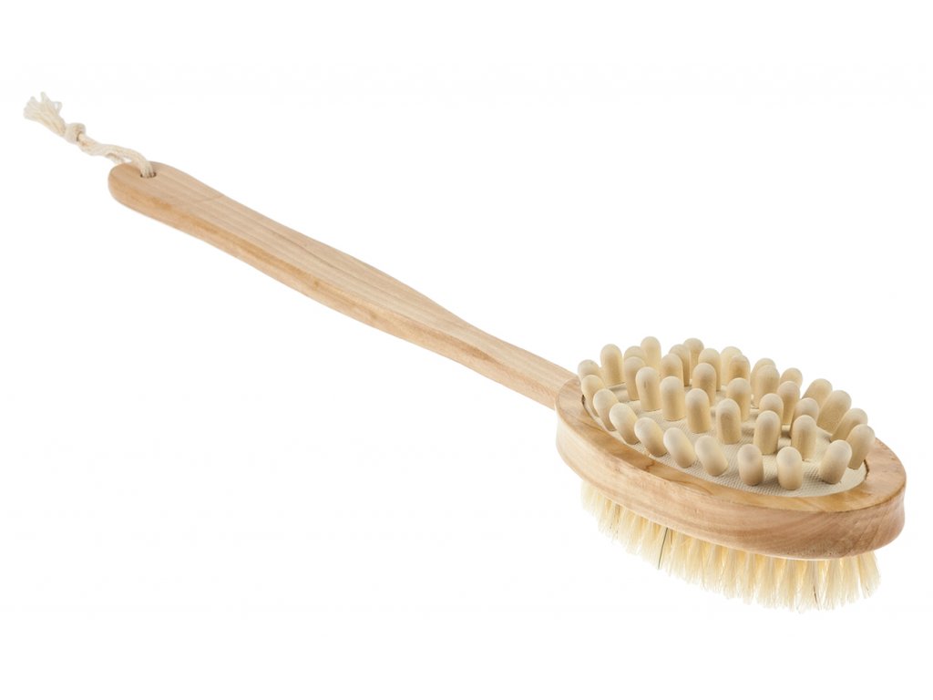 Oboustranný kartáč na mytí a masáž zad je ideálním pomocníkem pro Vaši každodenní koupel. Díky dlouhé rukojeti si můžete pohodlně umýt či namasírovat i střed zad, kam se s běžnými žínkami a kartáčky nedostanete. Kartáč je vyroben ze dřeva a přírodních materiálů.