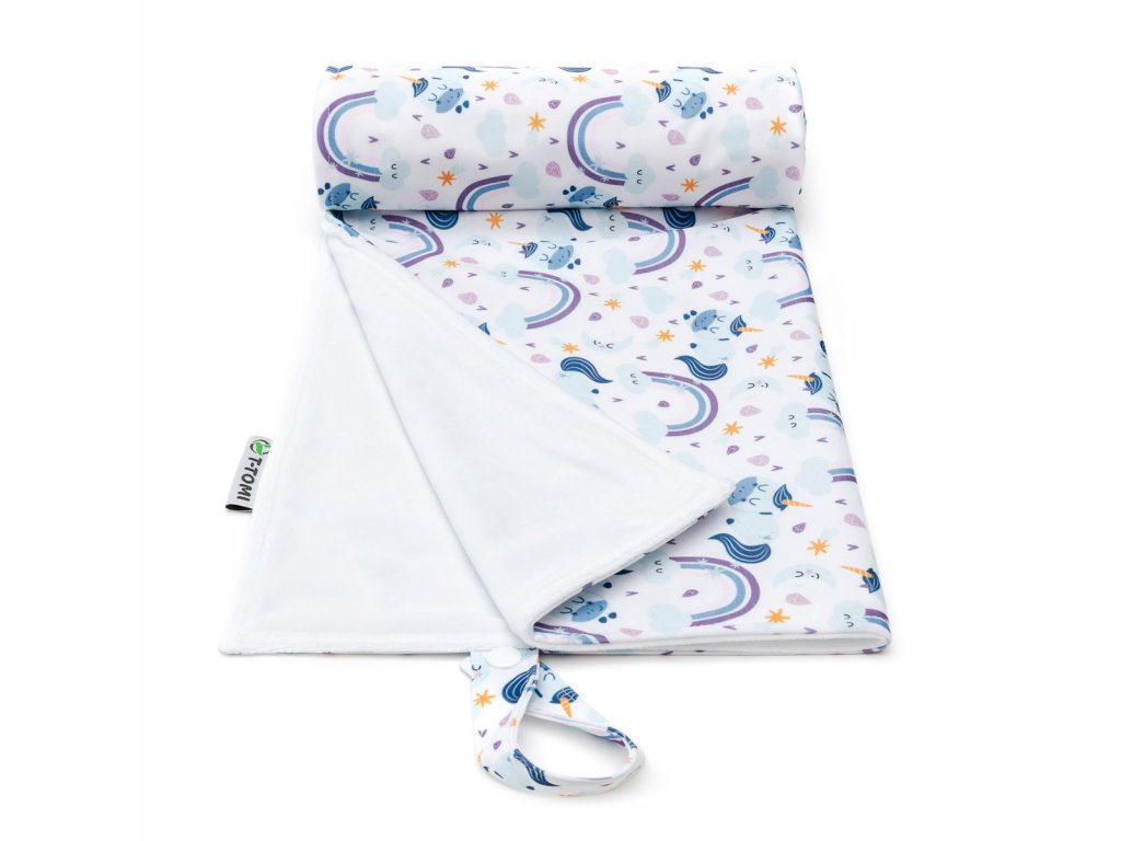 100% polyester s PUL zátěrem dotyková vrstva – kojenecký plyš rozměr 50 x 70 cm praktické ucho s patentkou všestranné využití moderní design