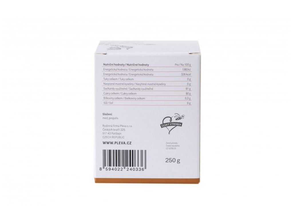 Propolis je v pastovaném medu. Pastování medu je technologický postup mechanického promíchávání, při němž med získává jemnou kašovitou konzistenci. Takto zpracovaný med nekrystalizuje, příjemnou konzistenci si zachovává dlouhodobě a dobře se s ním pracuje - zůstává měkký, snadno se nabírá, je dobře roztíratelný a přitom nestéká.