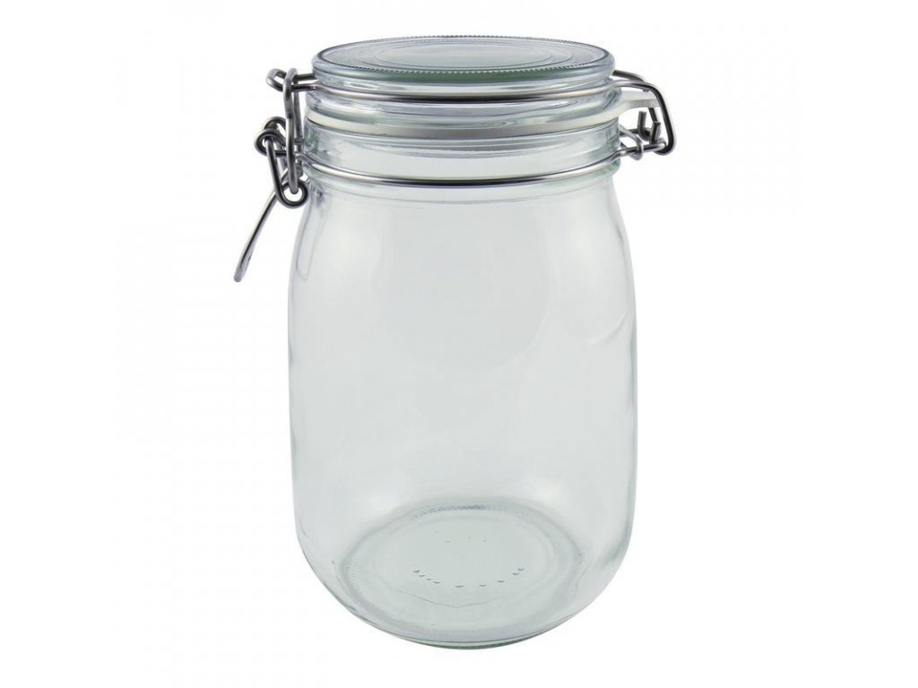 Skleněná větší dóza o objemu 1140 ml je vyrobena ze silného skla, opatřena drátěným patentním uzávěrem s pryžovým těsněním.