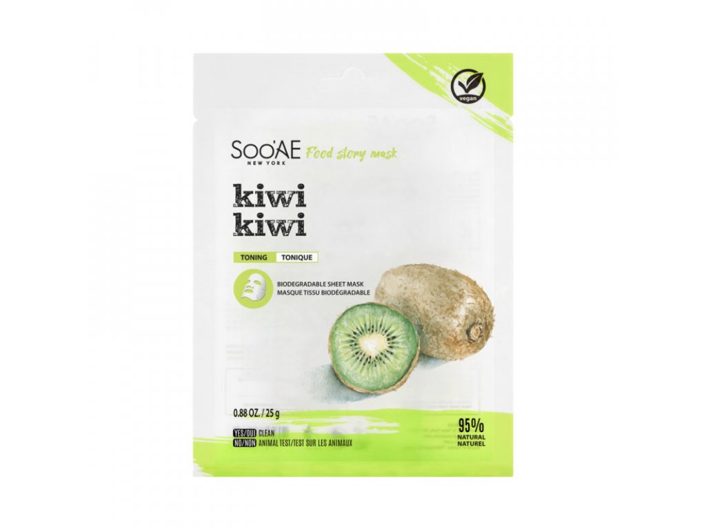 Veganská tonizační maska FOOD STORY MASK - KIWI s čistým extraktem z kiwi pomáhá tonizovat ochablou pleť. Tato maska je biologicky odbouratelná pro ekologičtější přístup k životnímu prostředí. Maska hydratuje a zpevňuje pokožku, je určena pro všechny typy pleti. Tkanina masky je vyrobena z vláken přírodního původu.