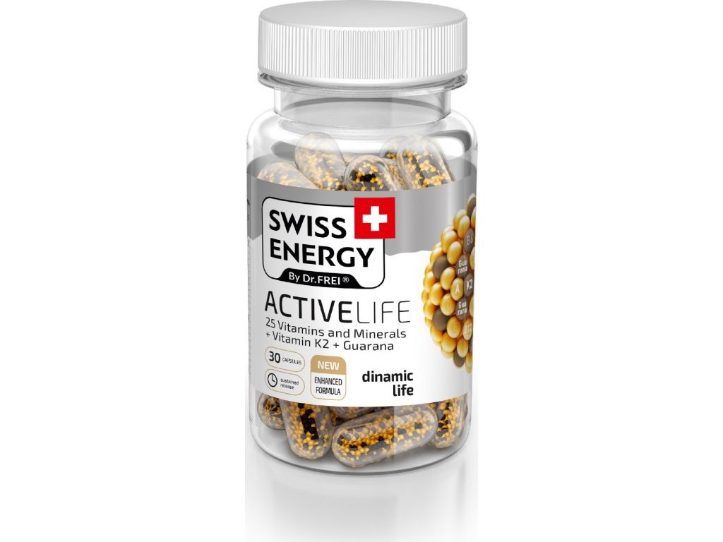 SWISS ENERGY ACTIVELIFE je komplex vitamínů a minerálů, který přispívá ke správné funkci metabolismu a ochraně buněk před oxidačním stresem. Guarana stimuluje činnost nervového systému a snižuje známky únavy. ACTIVELIFE je vhodný při aktivním životním stylu a náročných fyzických aktivitách.