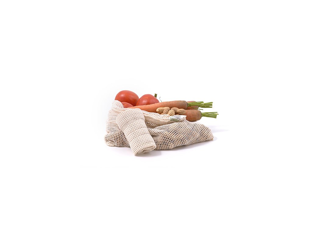 Síťovinový sáček s hustší čtvercovou sítí se hodí zejména na ovoce a zeleninu, která do něj jde nakoupit a ve kterém je možné ji i skladovat – místo obvyklých igelitů. Rozměr 38 x 30 cm. Schváleno Státním zdravotním ústavem na použití pro potraviny.