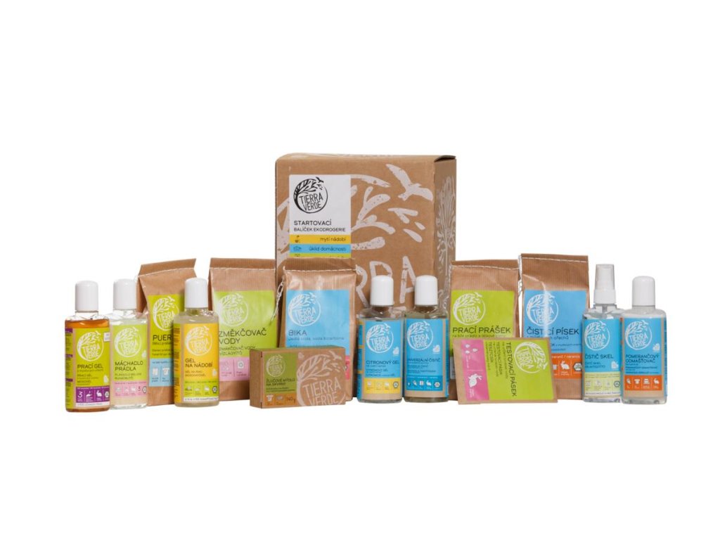 V tomto startovacím balíčku se na vás těší 14 testovacích balení eko produktů TIERRA VERDE, se kterými uklidíte, umyjete nádobí i vyperete prádlo.