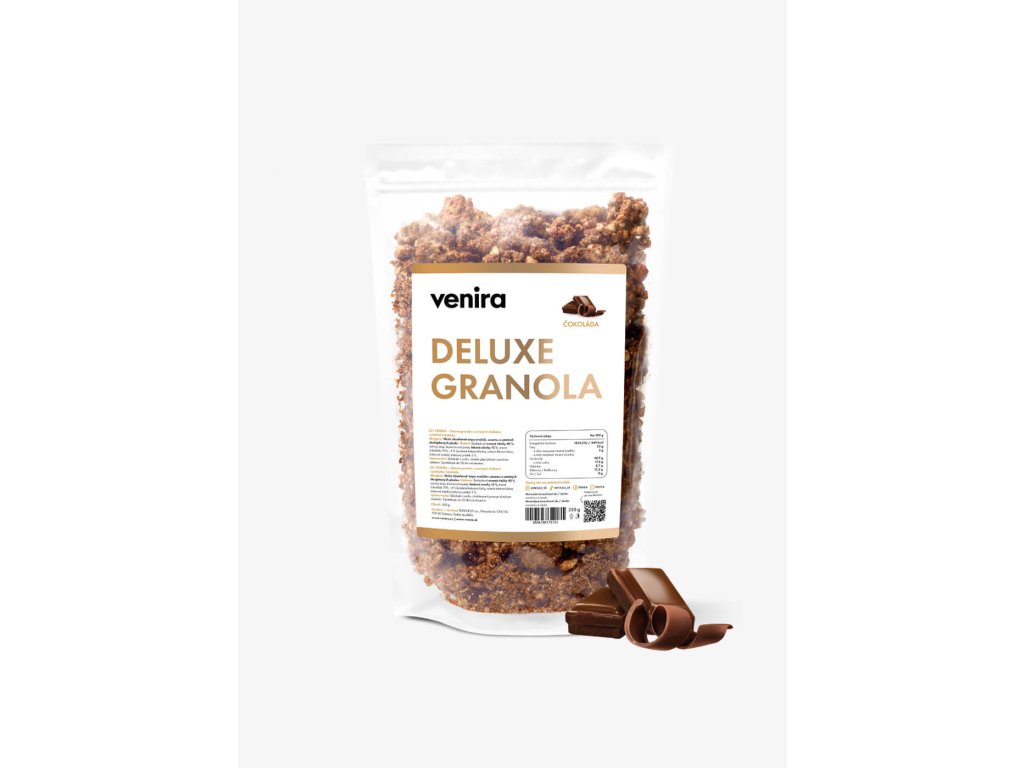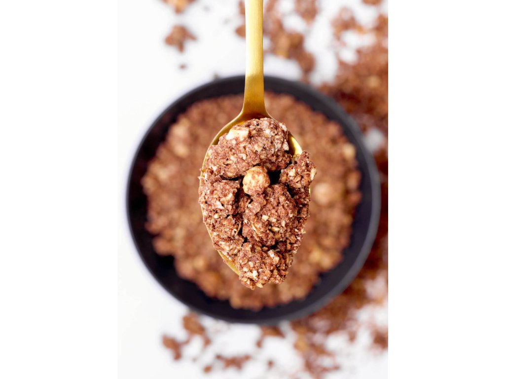 Čokoládová granola je perfektní volbou pro ráno plné energie a sytosti, obsahující pouze přírodní ingredience: jemně mleté bezlepkové vločky, lískové ořechy, rýžový sirup, 70% tmavou čokoládu, kakaový prášek a slunečnicovou pastu.