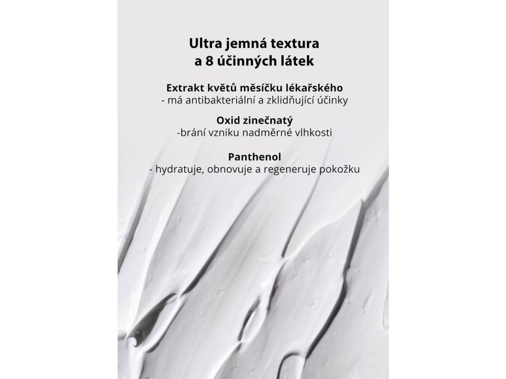 - Měsíček lékařský: Regeneruje a zklidňuje citlivou pokožku, chrání před podrážděním.
