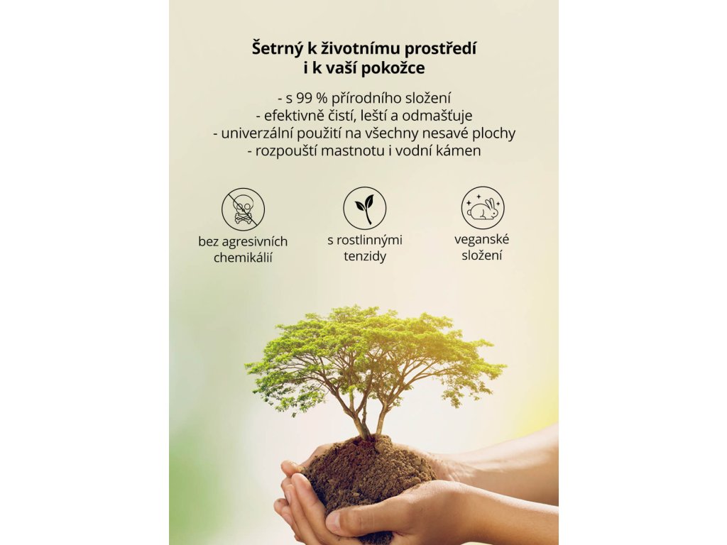 Díky rostlinným tenzidům si snadno poradí s nečistotami na nesavých površích, a to zcela bez škodlivých chemikálií. Odstraňuje zaschlé skvrny, vodní kámen, mastnotu i prach, aniž by zanechával šmouhy.
