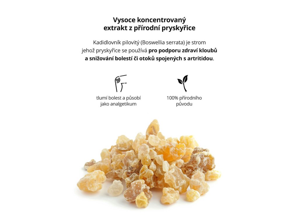 - Boswellia serrata (100 mg) – přírodní pryskyřice s protizánětlivými účinky, pomáhá proti bolesti a otokům