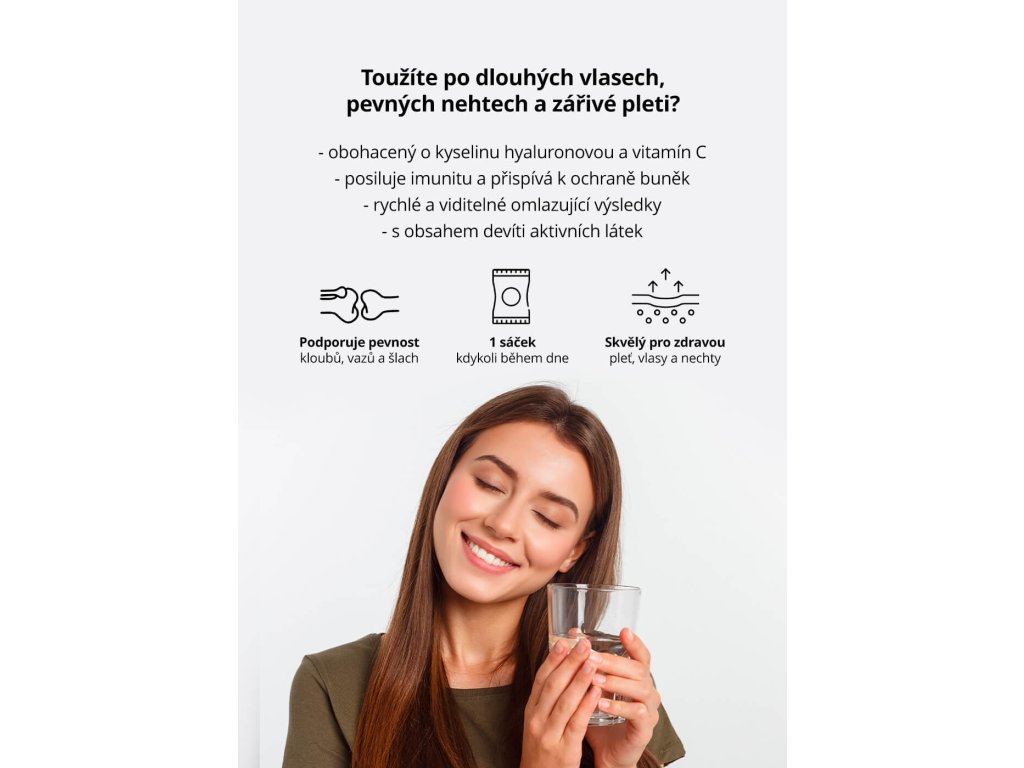 Co vás skutečně dostane, je jeho složení. Denní doporučená dávka obsahuje 4 000 mg 100% bioaktivního hydrolyzovaného kolagenu prvotřídní kvality, kyselinu hyaluronovou, vitamin C a dalších šest aktivních látek pro krásné vlasy, nehty a pleť.