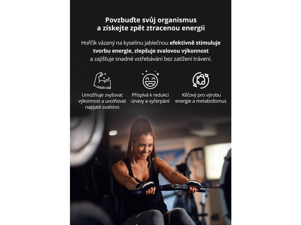 • Hořčík (malát hořečnatý) – přírodní kombinace hořčíku a kyseliny jablečné zajišťuje vysokou biologickou dostupnost a přináší výhody v podobě zlepšeného energetického metabolismu, uvolnění svalstva a zmírnění křečí.