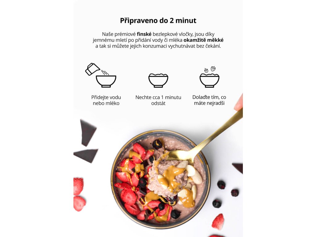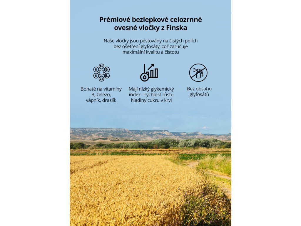 - Prémiové ingredience – 100% přírodní, jemně mleté ovesné vločky finské kvality bez glyfosátů.