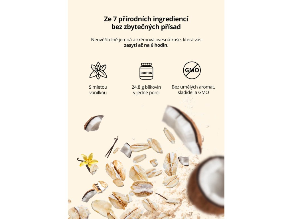Za lahodnou snídaní nebo vydatnou svačinkou připravenou již za 1 minutu stojí pouze přírodní ingredience – prémiové celozrnné vločky, protein z kravského mléka, strouhaný kokos a sušené kokosové mléko společně s bourbonskou vanilkou a minimem třtinového cukru.