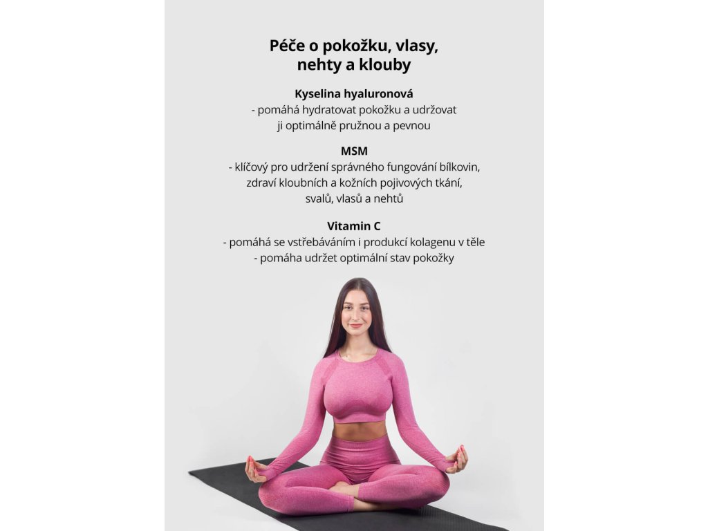 - MSM – klíčový pro zdraví pojivových tkání, svalů a vlasů.