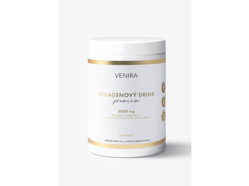 VENIRA PREMIUM kolagenový drink pro vlasy, nehty a pleť je nápoj obsahující 8000 mg bioaktivního hydrolyzovaného kolagenu, kyselinu hyaluronovou, vitamin C a dalších osm aktivních látek v každé denní dávce.