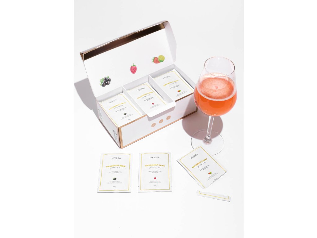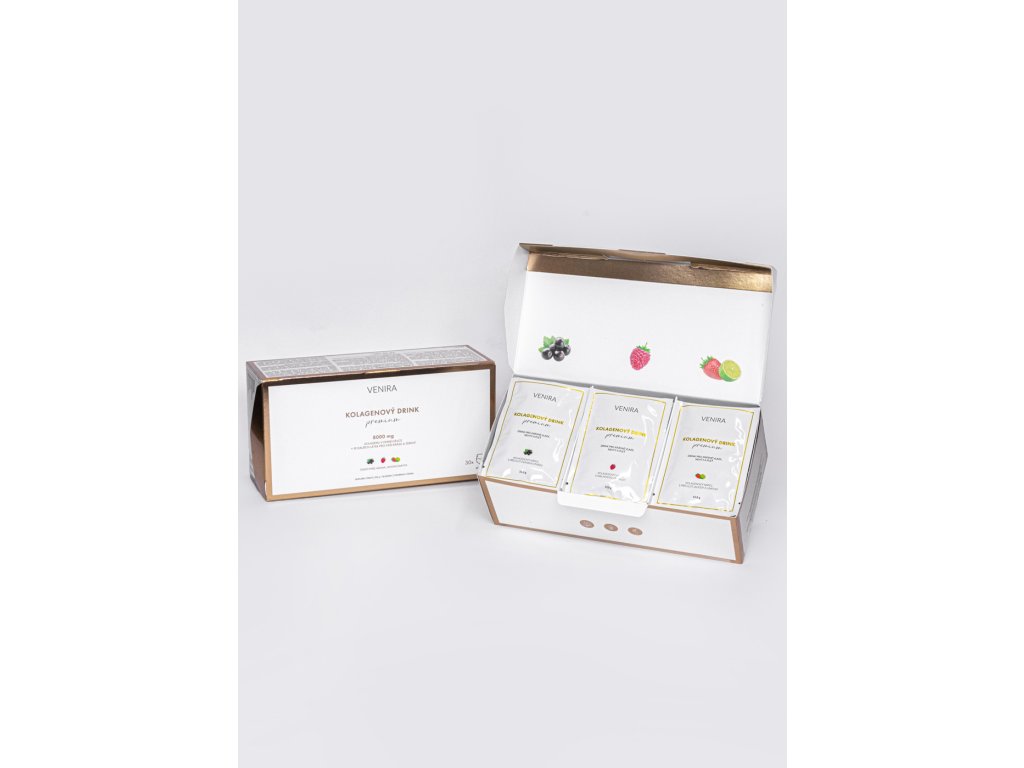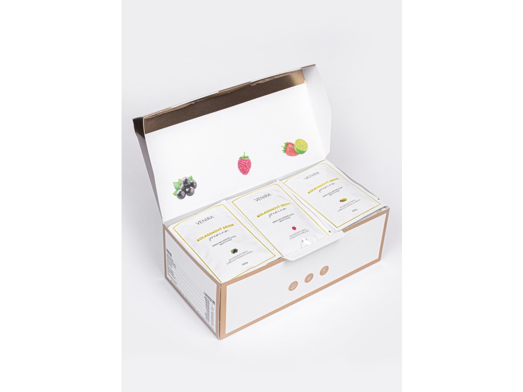 VENIRA PREMIUM kolagenový drink pro vlasy, nehty a pleť, mix příchutí (jahoda-limetka, černý rybíz, malina), 30 sáčků