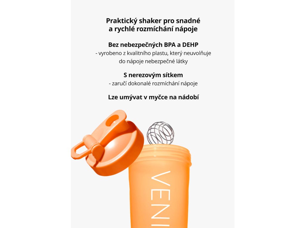 S moderním a minimalistickým designem s logem VENIRA slouží naše shakery nejen k praktickému využití, ale i jako stylový doplněk do fitka. Díky integrované míchací nerezové spirále uvnitř shakeru je zaručena optimální konzistence jakýchkoliv práškových nápojů pro každý doušek bez hrudek a usazenin. Kulatý tvar shakeru umožňuje jeho snadné uchopení, což poskytuje komfortní manipulaci i pohodlnou konzumaci.