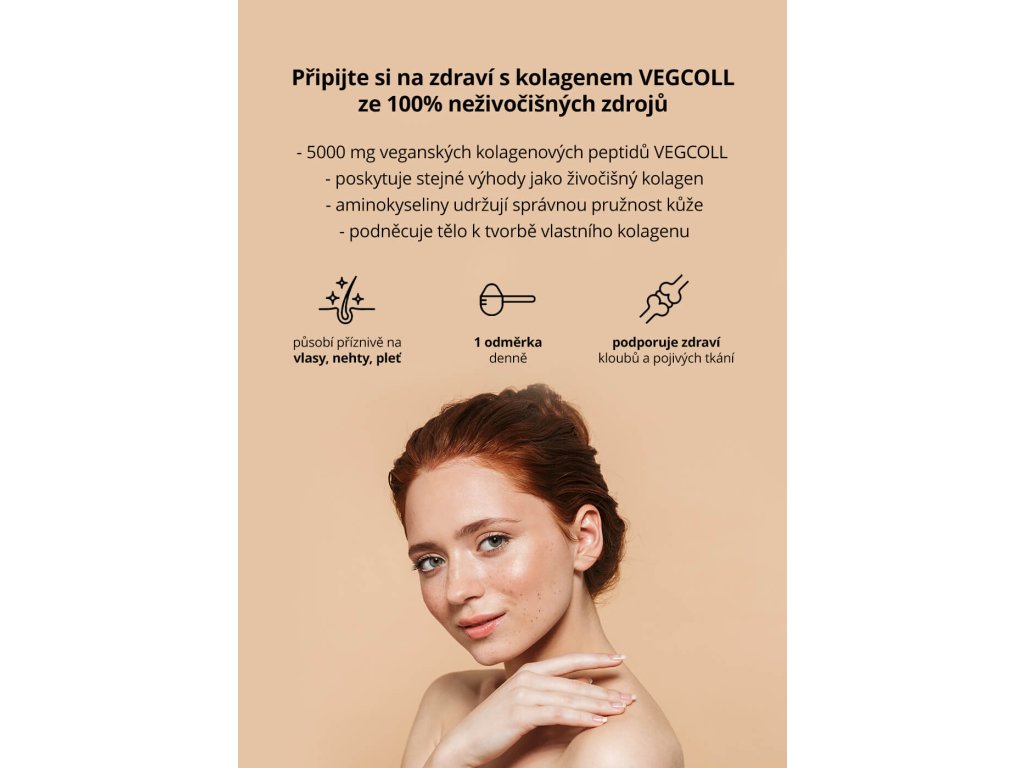 Veganské kolagenové peptidy VEGCOLL – přírodní forma rostlinného kolagenu bez GMO, obohacená o komplex důležitých aminokyselin.