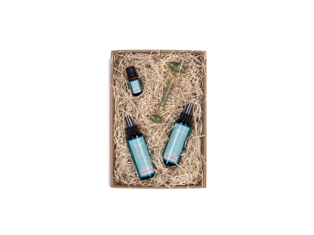 Elegantní dárkové balení obsahuje vše potřebné pro komplexní péči o pleť a tělo – od jadeitového masážního rolleru po aromatické pleťové vody a esenciální olej.