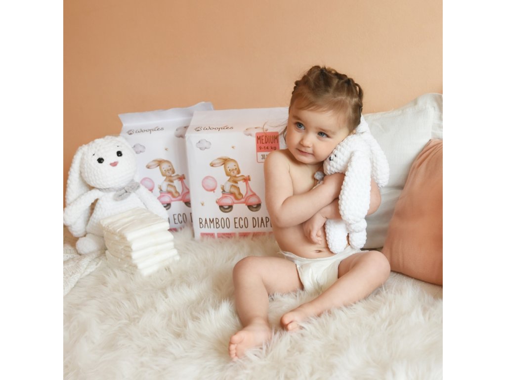 Dětské plenky jsou mimořádně měkké a jemné. Díky bambusovým vláknům umožňují pokožce volně dýchat. Dětské bambusové pleny Woopies neobsahují chlór, latex, alkohol, PVC, umělé aroma ani ftaláty a poskytují vašemu dítěti čisté a ekologické řešení.