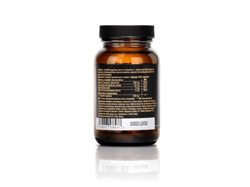 L-tryptofan veganský (250 mg), vitamin C (kyselina L-askorbová) (250 mg), hořčík (Diglycinát hořečnatý) (25 mg), objemové činidlo: akáciová vláknina, vitamin B3 (nikotinamid) (5 mg), vitamin B6 (pyridoxínhydrochlorid) (5 mg).