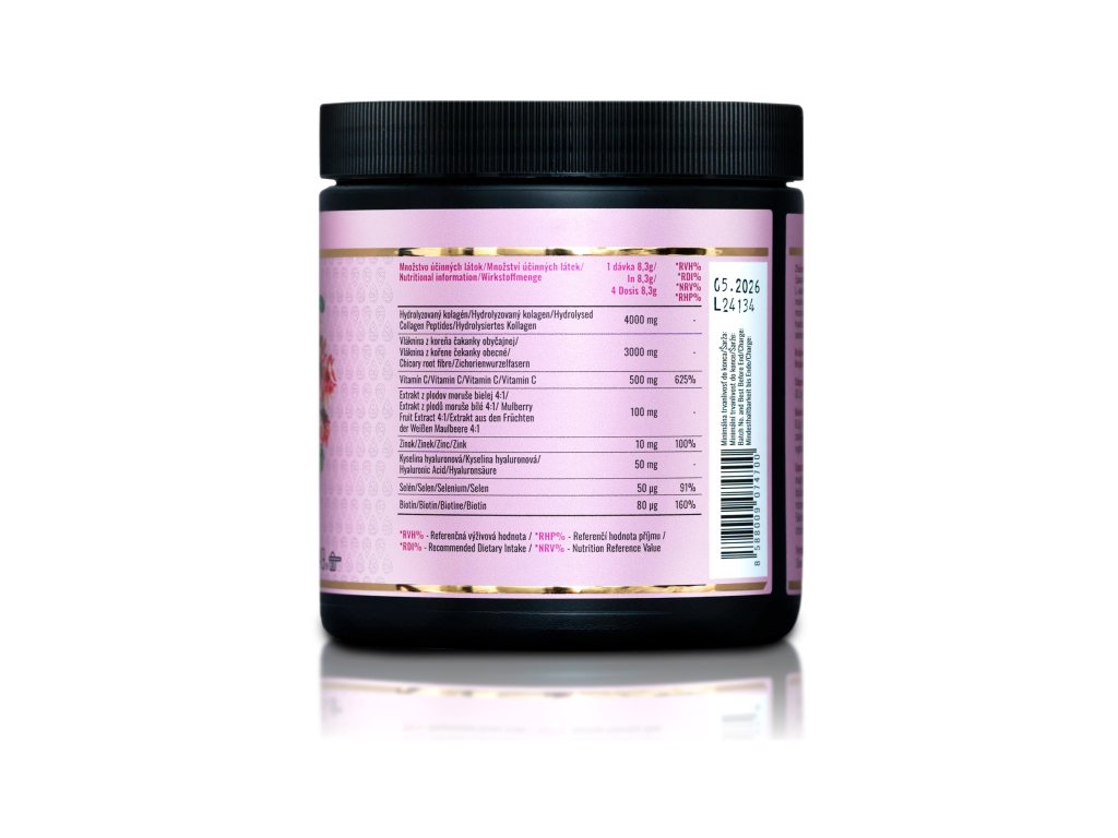 Složení v jedné dávce: Hydrolyzované kolagenové peptidy typ I, III: 4000 mg, Vláknina z kořene čekanky obecné (Cichorium intybus): 3000 mg, Vitamín C (Kyselina L-askorbová): 500 mg, Extrakt z plodů moruše bílé (4:1): 100 mg, Zinek: 10 mg, Kyselina hyaluronová: 50 mg, Selen: 50 µg, Biotin: 80 µg, Sladidlo: extrakt z listů stévie: 26,7 mg, Regulátor kyselosti: kyselina jablečná: 203 mg, Přírodní příchuť: malina: 167 mg, Barva: koncentrovaná šťáva z červené řepy: 167 mg.