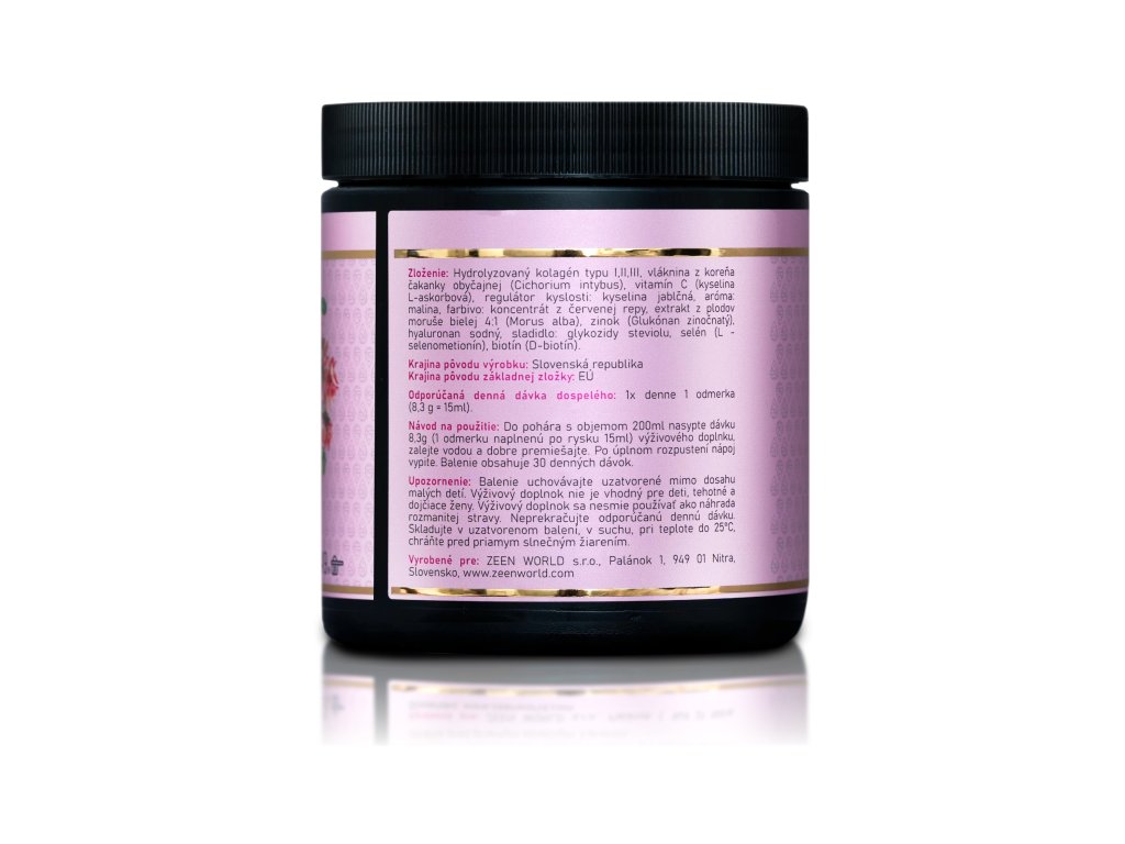 Hydrolyzovaný typ I, III s malinovou příchutí se složením obohaceným o vlákninu z kořene čekanky, extrakt z moruše bílé, vitamín C, selen, zinek, kyselinu hyaluronovou a biotin – složení pro dokonalou péči o pokožku, vlasy a nehty.