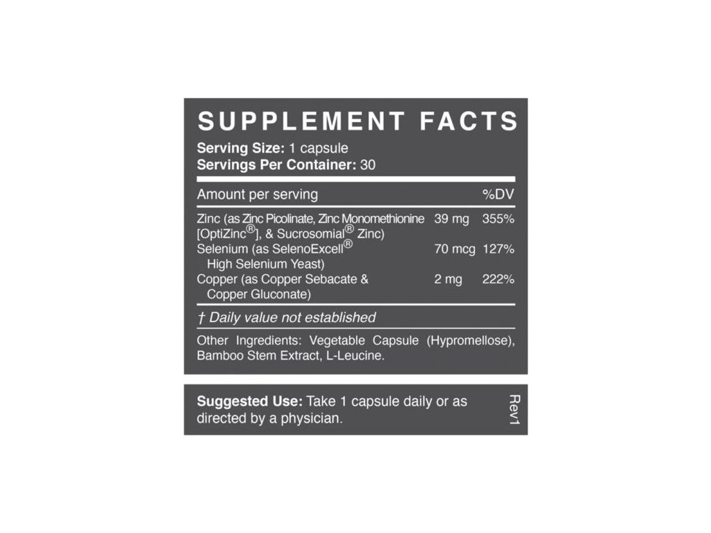 Složení: Zinek (jako bisglycinát zinku a monomethionin zinku [OptiZinc®]), selen (jako kvasinky s vysokým obsahem selenu SelenoExcell®), měď (jako glukonát mědi) a ACTIValoe® Aloe Vera (Aloe Barbandensis) gel QM Powder 200x.